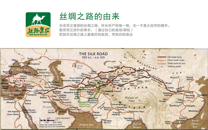漫漫絲綢之路,書寫古老.燦爛.輝煌的中華文明。浩浩渺渺,起伏不斷的沙漠,秀美萬千的山川,造就了今日的絲路果農(nóng)。優(yōu)越的地理環(huán)境,璀璨的中華文明,讓絲路果農(nóng)有了立足的物質(zhì)土壤和精神家園。絲路中國,絲路新疆,絲路果農(nóng),讓我們一起成長!