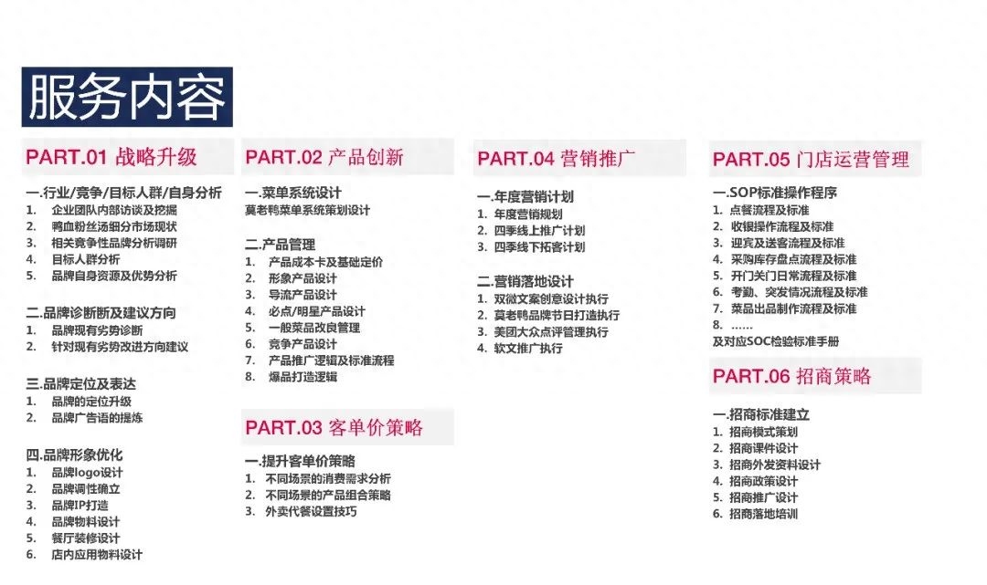 美御為莫老鴨提供品牌升級的方案與服務,給莫老鴨的定位是「新派·老鴨粉絲湯」,最核心的關鍵點是把原來只做快餐的模式升級為”快餐標準+小吃類目”,打造爆品“招牌養(yǎng)胃珍味鴨血粉絲湯”,設計開發(fā)了一系列“鴨血粉絲湯+鴨類小食”的套餐,讓莫老鴨的客流量不僅限于某一時間段,而是能在不同時間段都能保持較高的客座率。