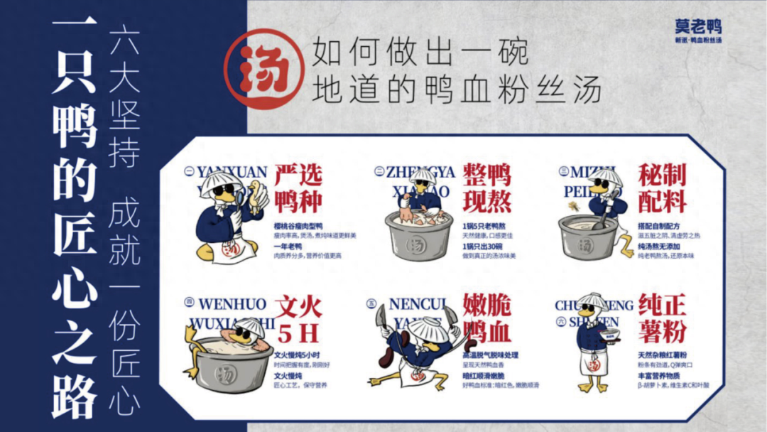美御賦予莫老鴨“新派鴨血粉絲湯開創(chuàng)者”的定位,對莫老鴨的產品進行了全新梳理和升級創(chuàng)新,首先,提煉莫老鴨鴨血粉絲湯的差異化賣點——湯底采用整鴨現熬,嚴選鴨種歷經5小時文火熬煮;鴨血采用嫩脆鴨血,經過處理呈現天然鴨血香味;粉絲采用雜糧紅薯粉,Q彈爽口,營養(yǎng)健康。這不是一碗普通的鴨血粉絲湯,而是一碗承載著匠心制作、美味健康、營養(yǎng)豐富的鴨血粉絲湯。其次,做品類精細化——提出“全鴨”小食的新吃法,幫助莫老鴨以鴨血粉絲為核心,外加其他鴨品鴨類的小吃,組合成爆款套餐,給消費者提供新穎齊全的鴨血粉絲湯吃法,豐富消費者關于“鴨”的味覺體驗。