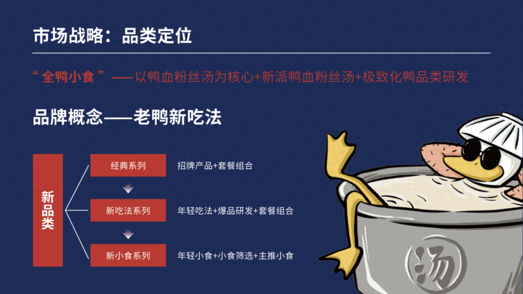 所以經過一系列的研究評估后,美御得出莫老鴨品牌的戰(zhàn)略定位——莫老鴨不應繼續(xù)在傳統(tǒng)快餐行業(yè)中內卷,而是重選賽道,改變品類,做更符合年輕消費群體喜愛的品類小吃,做「新派·鴨血粉絲湯」。