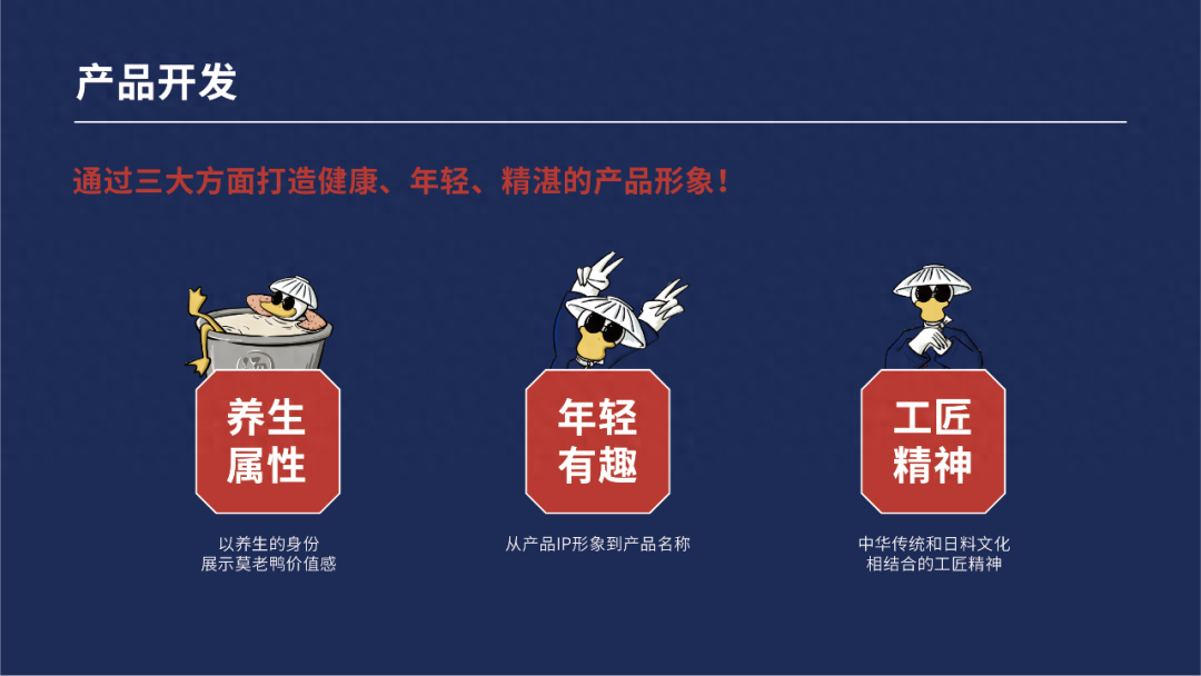 深入挖掘鴨血粉絲湯市場、消費者需求和莫老鴨自身資源優(yōu)勢后,美御定制出以一碗“安全放心+天然健康+真材實料”的鴨血粉絲湯為核心+全鴨小食搭配的產品定位,用新餐飲+新零售的模式,通過“養(yǎng)生屬性+年輕有趣+工匠精神”三方面,全新打造莫老鴨健康年輕精湛的品牌形象。希望不僅能消除人們對鴨血粉絲湯的消極印象,更借此傳達莫老鴨品牌主張和匠心精神,真正將其做成「新派·老鴨粉絲湯」。
