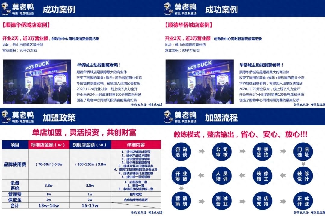 美御還依據多年來餐飲行業(yè)的觀察和案例反饋,為莫老鴨定制招商政策,協(xié)助莫老鴨全國招商,并提供相應的運營支持服務,幫助品牌完成可持續(xù)的長期商業(yè)增值。在莫老鴨品牌升級后的1年內新增100家加盟店,年銷售額三倍增長,21年全年銷售額突破2億+。