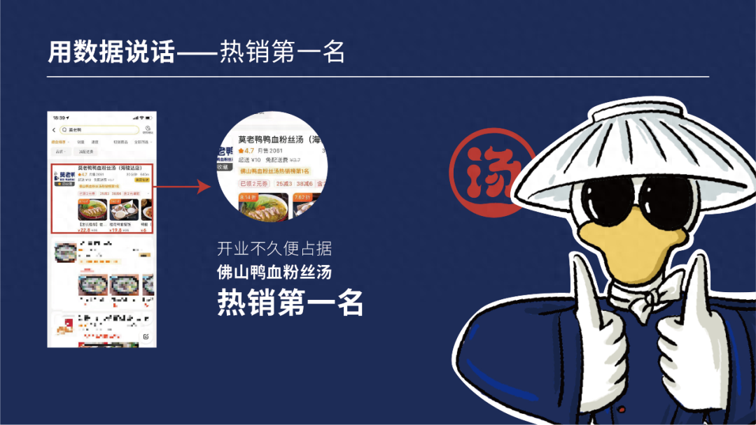 美御在調研時發(fā)現兩個關鍵點。第一,“鴨血粉絲湯”常年霸占美食榜頭名,且店鋪布滿大街小巷。美團外賣統(tǒng)計數據顯示,在南京地區(qū),2018年鴨血粉絲湯單量比2017年增長了3倍,全年賣出了200多萬單,全國的鴨血粉絲湯店鋪遍布大街小巷。這就導致雖然鴨血粉絲湯好賣,但莫老鴨混在全國各個鴨血粉絲湯品牌里,品牌形象整體視覺表達雜糅,尚未形成系統(tǒng)的視覺語言,不足以在行業(yè)形成獨特身份,更難以在消費者心中建立起品牌認知。第二,當今的消費者越來越關注食品健康,鴨血粉絲湯的質量不足以讓消費者放心品嘗,這就說明莫老鴨必須在鴨血粉絲湯的品質上必須做到行業(yè)上乘,做出讓消費者看得見、放心吃的優(yōu)質鴨血粉絲湯。