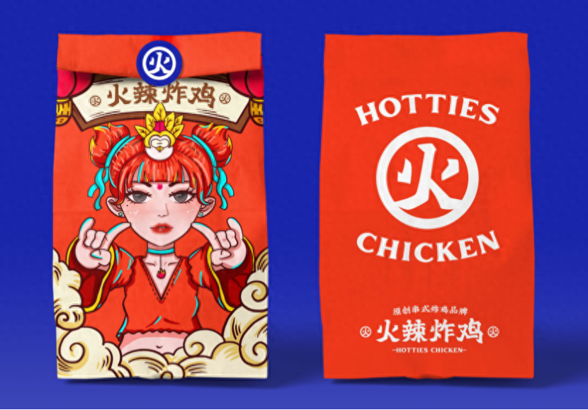 標(biāo)志以“火辣炸雞”字體作為創(chuàng)作核心,字體融入了傳統(tǒng)書法字的形態(tài),并結(jié)合了現(xiàn)代字體的特征,表達新中式的概念,同時將“火”的概念融入標(biāo)志中,作為我們的超級符號。品牌定位傳達原創(chuàng)串式炸雞的品牌概念,英文部分結(jié)合“串”的概念進行藝術(shù)創(chuàng)作,極富視覺表現(xiàn)力。紅藍對比色的組合讓品牌辨識性強且現(xiàn)代時尚,有利于品牌的傳播與推廣。