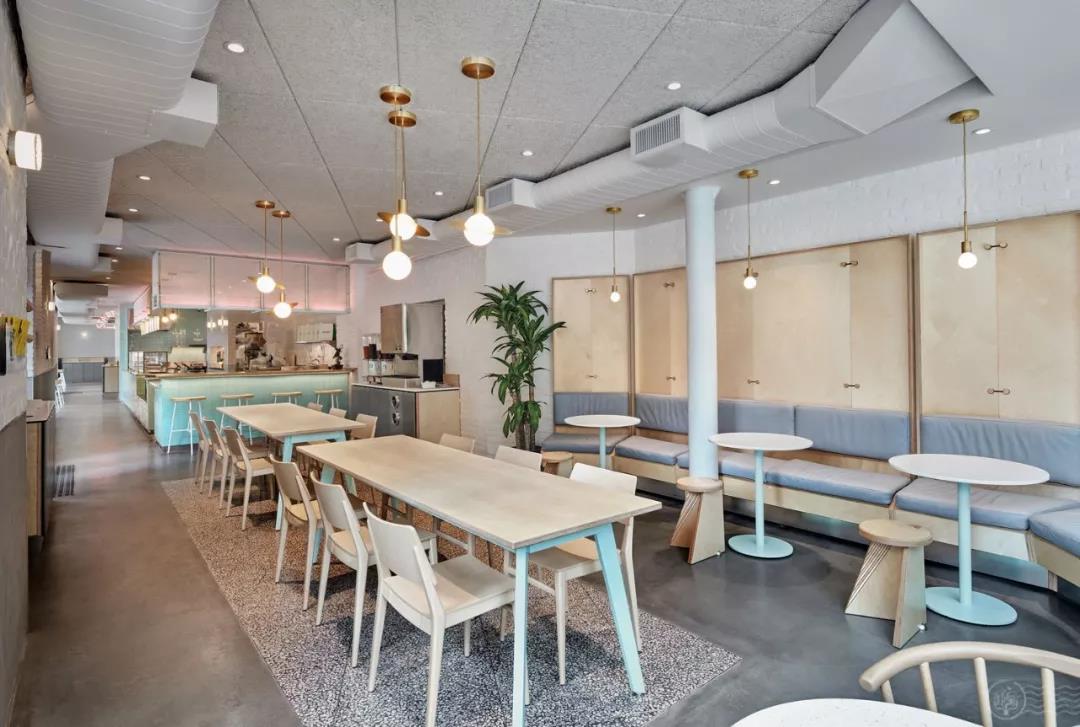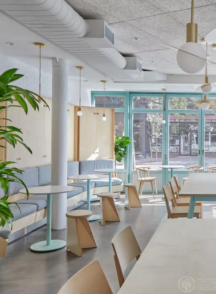 薄荷綠的玻璃充滿夢(mèng)幻的色彩。整個(gè)空間的座椅皆由薄荷綠底座和大理石、實(shí)木搭配。由混泥土澆筑的地板模糊了街道與餐廳的界線,突出餐廳中央黑白石子地板所在的公共桌椅。
