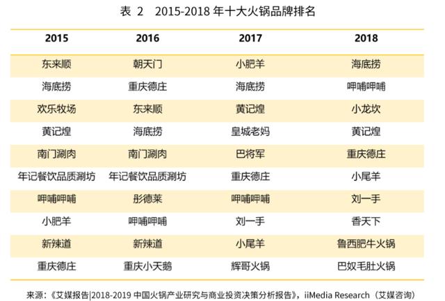 iiMedia Research(艾媒咨詢)數(shù)據(jù)顯示,在2015-2018年十大品牌統(tǒng)計(jì)中,榜首易主頻繁。但海底撈、呷哺呷哺兩家火鍋店始終在榜,并在2018年分別位居第一、第二。